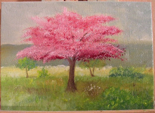 Today's art (disaster) is a pretty poor attempt at an alla prima copy of William Whitaker's painting "Spring Tree." Mine is painted on canvas board in oil. The canvas was primed with light gray gesso. Starting out I coated the whole canvas in a yellow ochre ground, then put in the hill/mountain area and the first pass on the sky. Then painted in the sun lit field in the background, then put in some of my green tones.
